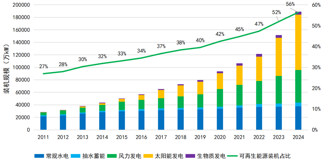 “十四五”期间,我国可再生能源规模不断扩大。2024年,我国可再生能源发电装机达到18.89亿千瓦,在电力装机中占比56%,可再生能源装机首次超过煤电,其中,风电光伏合计装机达到14.06亿千瓦。2024年,我国可再生能源发电量达到3.47万亿千瓦时,约占全部发电量的35.2%。风电太阳能发电量合计1.83万亿千瓦时,约占全社会用电量的18.6%,与同期第三产业用电量(18348亿千瓦时)基本持平。截至2025年6月底,我国可再生能源装机达到21.59亿千瓦,约占我国总装机的59.2%,其中,风电、太阳能发电累计装机达18.9亿千瓦。