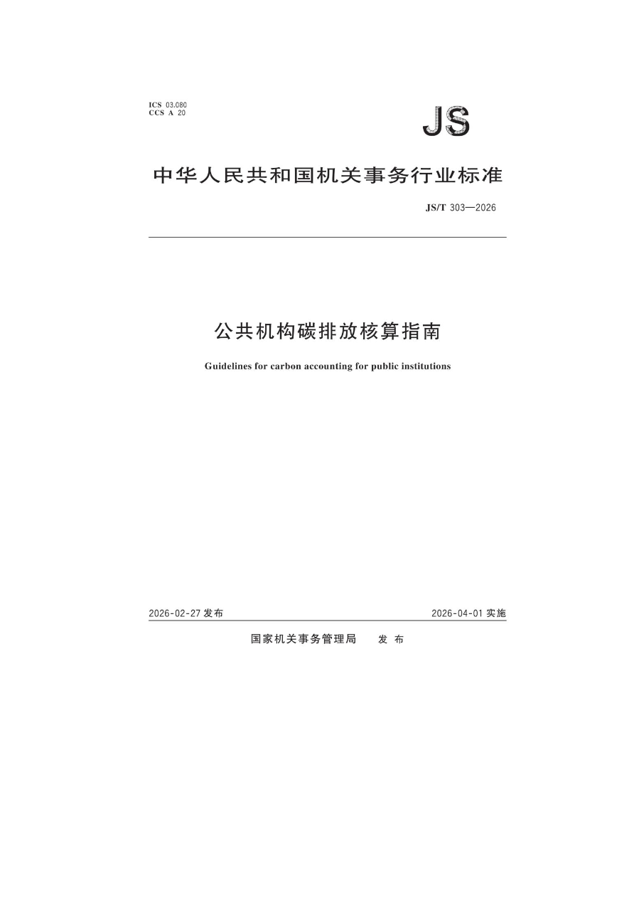 现发布机关事务行业标准《公共机构碳排放核算指南》,编号为JS/T 303-2026,自2026年4月1日起实施。